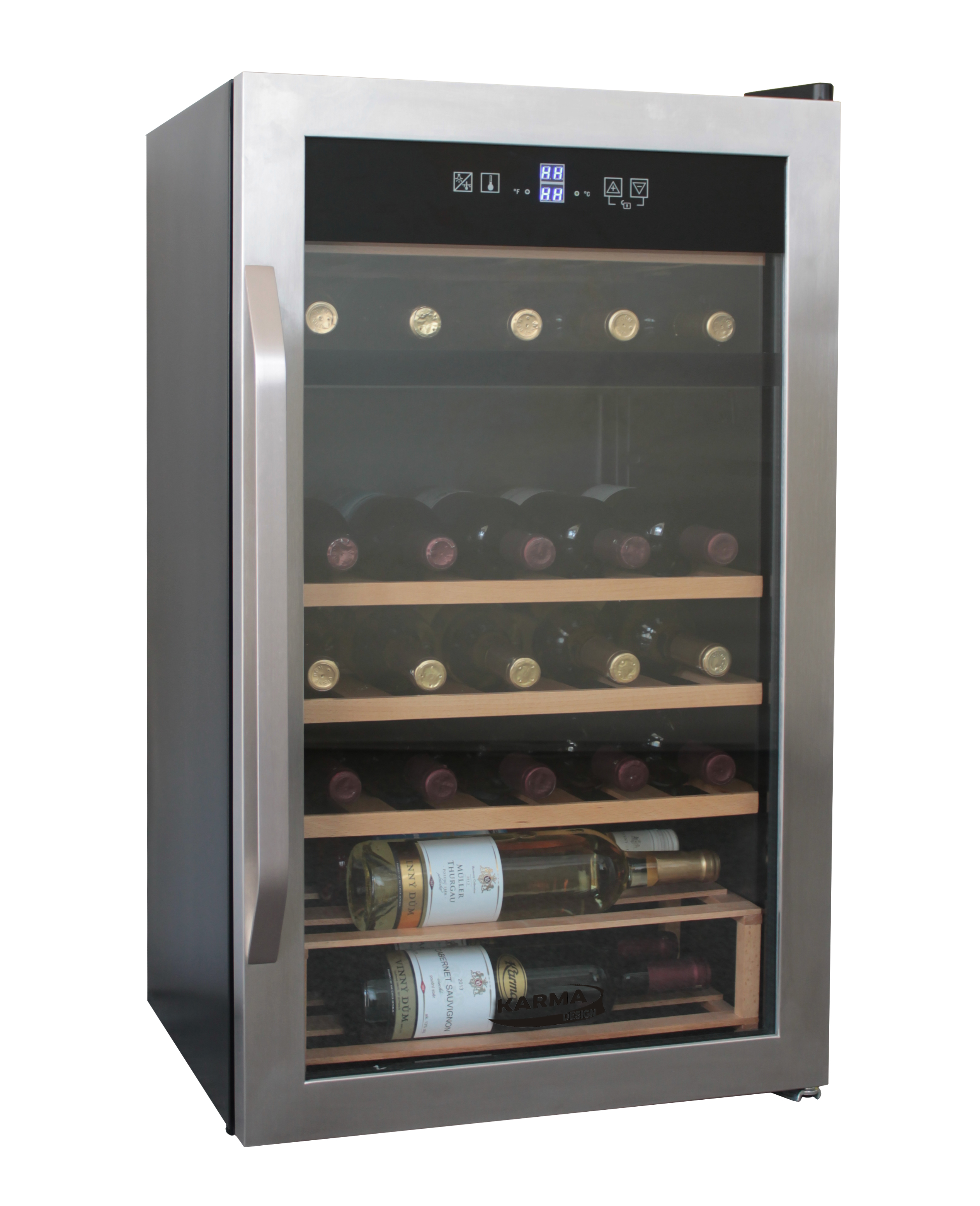 Elegantní nerezová vinotéka pro uskladnění lahví vína se dvěma oddělenými teplotními zónami.
